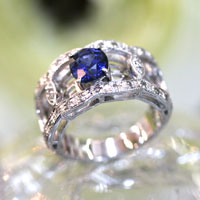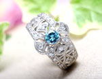 透かしのミル打ちアンティクリングに0.3ctの幸せを呼ぶサムシングブルーがきらりと輝くエンゲージリング