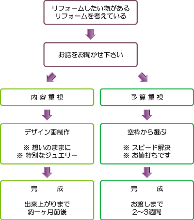 - 例えば、お手持ちのダイヤリングをペンダントにリフォーム加工したい場合ご要望をこちらのフォームメールで送信してください。
